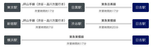 • 日吉駅(東急東横線、東急目黒線、東急新横浜線/横浜市営地下鉄グリーンライン)徒歩1分