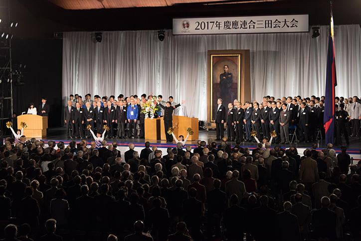 日吉記念館において執り行われた記念式典では、大林剛郎大会実行委員長による開会宣言の後、塾旗登壇、塾歌斉唱、比企能樹慶應連合三田会会長挨拶、長谷山彰塾長祝辞と続き、参加者全員による「若き血」の斉唱がありました。