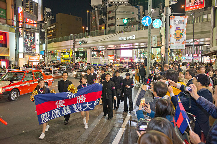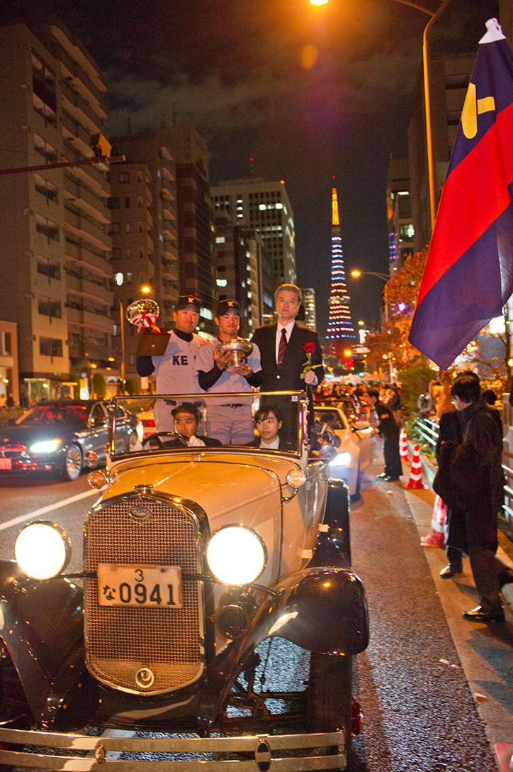 翌日10月31日の閉会式終了後、明治神宮外苑・絵画館前から三田キャンパスまでのパレードと三田山上での優勝祝賀会が行われ、パレードには約1000人、優勝祝賀会には約1500人の塾生、塾員などが参加し、優勝の喜びを分かち合いました。