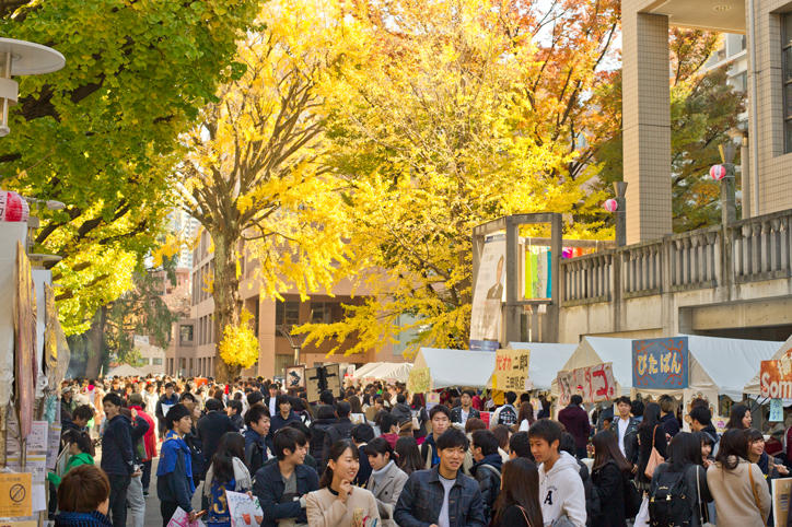 三田祭は「独立自尊」の精神に基づき、塾生(在学生)自らの手で企画・運営されている日本最大規模の学園祭です。本年も約400の参加団体が、第一線で活躍するゲストを招いた講演会、各教室でのゼミナール研究発表や展示を行い、日頃の成果を発表しました。中庭には模擬店が立ち並び、屋外ステージではダンスやライブなど個性溢れるパフォーマンスが繰り広げられました。銀杏の木が鮮やかな黄色に色づく三田キャンパスは、多くの来場者で賑わいました。