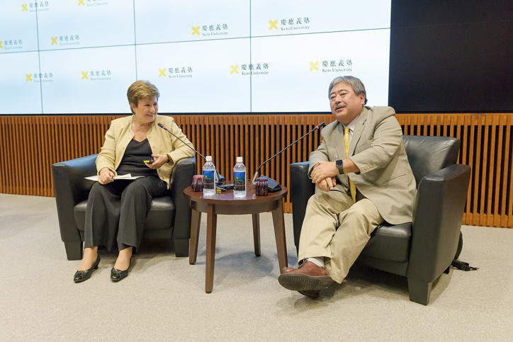 講演後、朝日新聞コンテンツ戦略ディレクターの藤谷健氏との対談が行われ、その後の質疑応答では塾生から複数の質問がなされました。「日本人は世界の平和にどのように貢献することができるか」との質問に対し、ゲオルギエヴァ氏は「発展途上国の人々の声を大事にし、彼らに関心を持つことが重要だ」と回答しました。