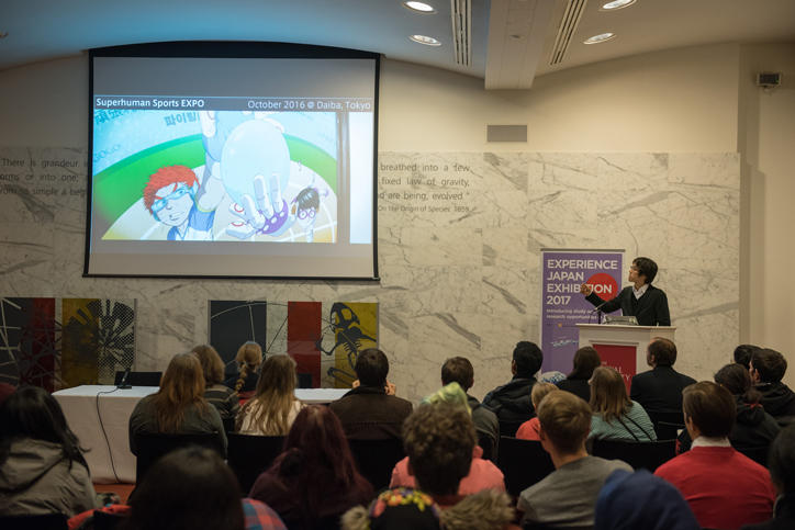 今年は14の日本の大学・学校および英国を拠点とする日本政府関連機関が参加し、英国を中心に約550名の来場者を迎え、日本の大学・学校への留学情報の提供のみならず、日本文化の魅力を英国の人々に対して発信しました。セミナーでは例年好評を博しているテーマのほか、来る東京オリンピック・パラリンピックの実施を意識した内容として、メディアデザイン研究科の南澤孝太准教授による“Superhuman Sports: Using advanced technology and design to enhance physical ability”と題した発表が行われ、参加者の関心を集めていました。