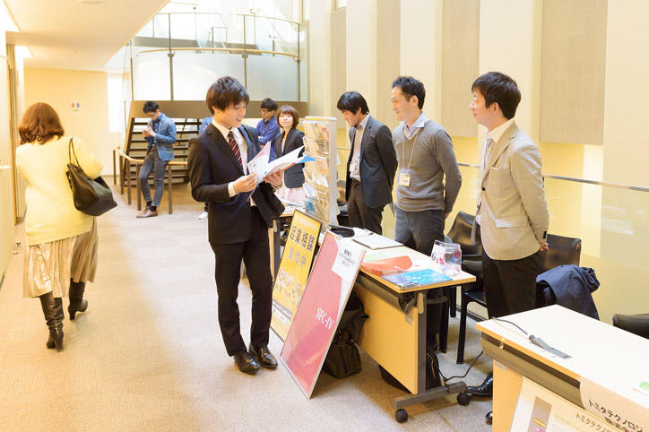 会場内には展示コーナーが併設され、慶應藤沢イノベーションビレッジとメンター三田会が起業相談会を実施した他、慶應関係のベンチャー企業など5社が出展し事業説明を行いました。