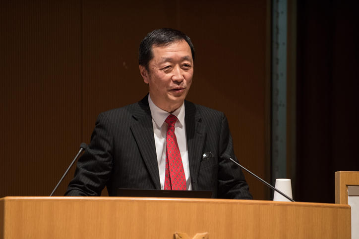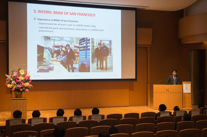 授与式は、清家篤塾長の開会挨拶に始まり、豊富なキャリア経験をもとに学生の指導にあたるメンター代表の山崎徹氏(富士ゼロックス株式会社)による来賓挨拶に続いて、真壁利明常任理事による基調講演が行われました。その後、プログラムコーディネーターの神成文彦理工学部教授から本プログラムの実績報告があり、修了生9名の研究内容の紹介や本プログラムの特色、現状について語られました。続いて、長谷山彰常任理事による修了証書授与、1期生9名による成果発表会が行われました。最後に、長谷山彰常任理事による閉会挨拶で授与式は締めくくられました。会場には多くの来場者があり、和やかな雰囲気のなか、修了生9名がグローバルに活躍するリーダーとなるための新たな一歩を踏み出しました。