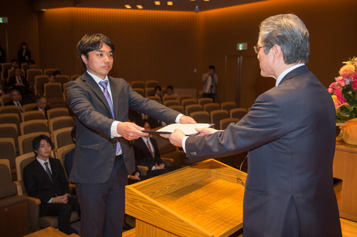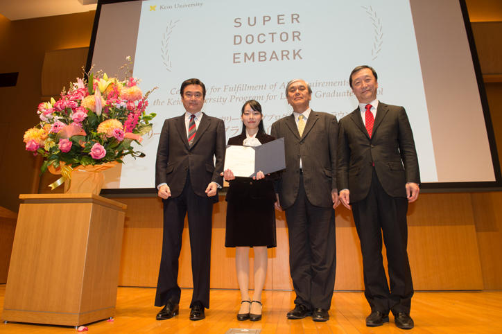 3月24日(金)、三田キャンパス北館ホールにて、博士課程教育リーディングプログラム(オールラウンド型)「超成熟社会発展のサイエンス」1期生の修了証書授与式と成果発表会が行われました。文部科学省の平成23年度「博士課程教育リーディングプログラム」に採択されてスタートした本プログラムは、本学大学院13研究科の中から選抜した学生を対象とし、国際社会を先導しながら超成熟社会の持続的な発展のために行動を起こすことができる専門性と総合力を備えた高度博士人材を育成することを目的としています。学生は、文理融合の修士・博士課程5年一貫のカリキュラムの下で活動し、5 年間で 2 つの修士号と1つの博士号の取得を目指します。