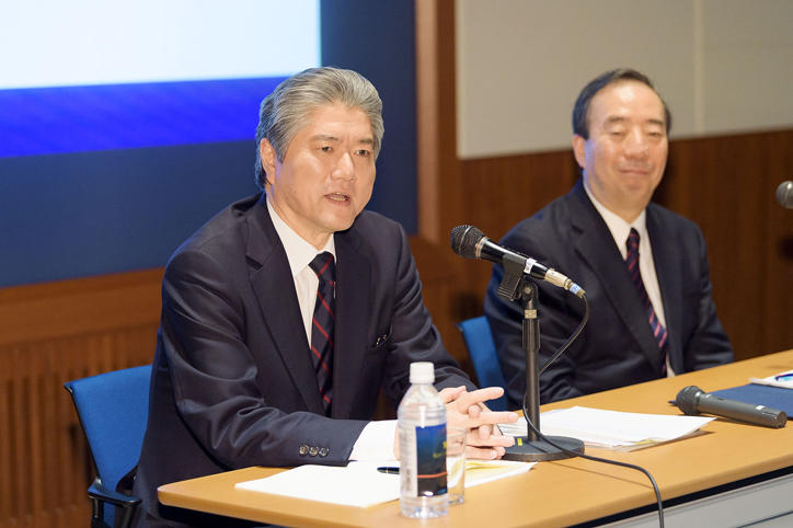 4月20日(木)16時半より、三田キャンパス東館G-Labにて、同日の慶應義塾臨時評議員会において次期塾長に選任された長谷山彰君(常任理事・文学部教授)および清家篤塾長による記者会見が行われました。
