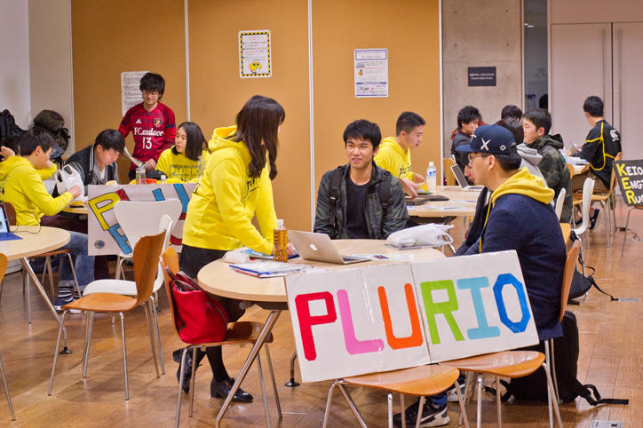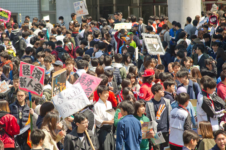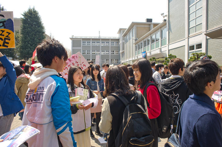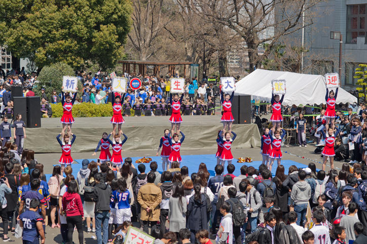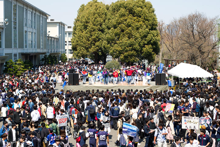 オリエンテーション期間の日吉キャンパスでは、さまざまな学生団体による新入生の勧誘やステージイベントが行われています。桜が見ごろを迎えた日吉キャンパスは活気に満ち、賑わいをみせていました。(撮影日:2017年4月4日)