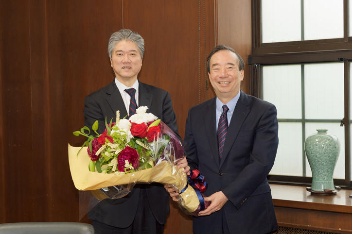 塾長メッセージ塾長プロフィール常任理事一覧清家篤前塾長は、5月27日をもって2期8年の任期を終え、塾長を退任しました。5月26日に行われた常任理事会終了後、三田キャンパス塾監局にて、教職員が見守るなか、感謝をこめて花束が贈られました。