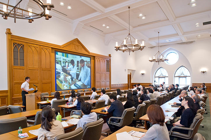 報告会は、大森正仁常任理事の開会挨拶にはじまり、4名の派遣留学生による発表が行われました。世界中から集まる優秀な人材とともに受けた質の高い教育は、派遣留学生の視野を大きく広げ、それぞれ将来に向けて、着実に大きな一歩を踏み出しました。帰国後、塾内高校において、留学生がこうした経験を同級生に伝え、刺激をもたらす波及効果も期待されます。