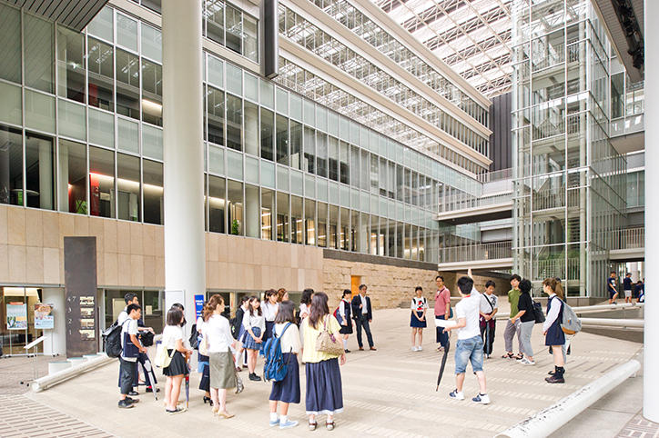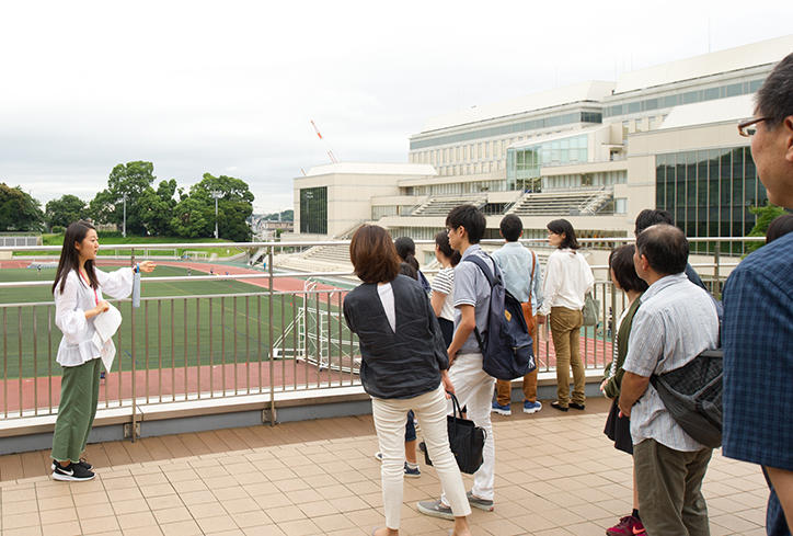 大学説明会では、建学の精神や理念、各学部やキャンパスの特徴、学生生活にかかわる事柄など、慶應義塾大学に関する全般的な内容について、入学センターの職員が説明を行いました。続いて行われたキャンパスツアーでは、学生ガイドが自分の学生生活の紹介を交えながら、約1時間かけて日吉キャンパスの見どころを案内しました。
