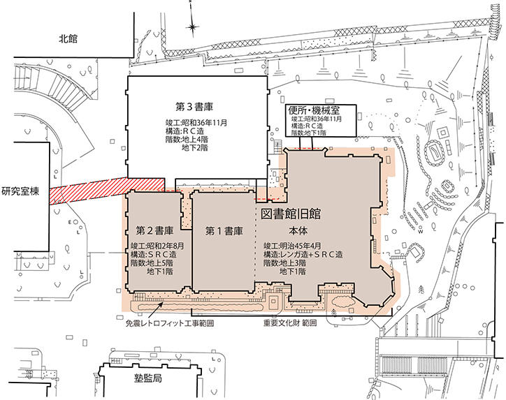 2017年8月現在、全体工事の約17%が進捗し、施工手順の(3)既存基礎・梁の補強構築を行っている段階です。劣化した箇所の保存修理作業は2018年から開始する予定ですが、作業が開始されると建物の周囲に足場を立てるため、工事終了までの間、図書館旧館の姿は見えなくなってしまうことになります。