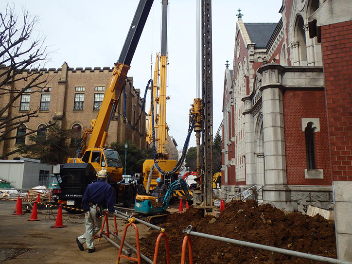 外から見ている限りは、一見してほとんど変化がありませんが、実際は、建物の下を掘り進んで免震層を構築していくという、非常に難しい工事が日々着実に実施されています。