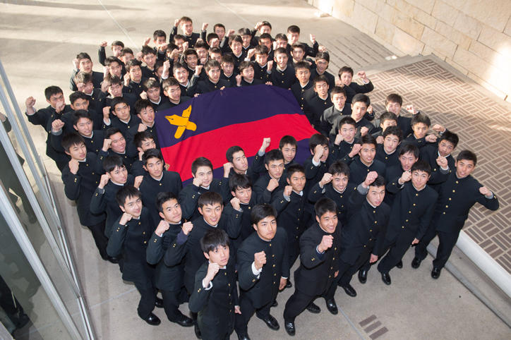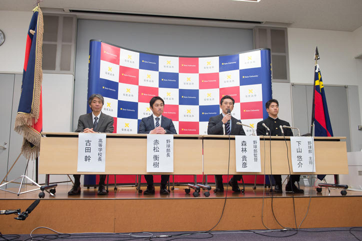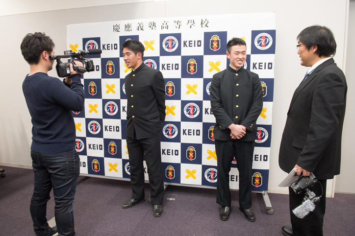 当日は、古田幹高等学校長が出場決定の連絡を受け、日吉キャンパスに詰めかけた大勢の報道陣を前に部員たちを激励しました。部員たちは喜びをかみしめながら、大舞台に向けて気を引き締めていました。