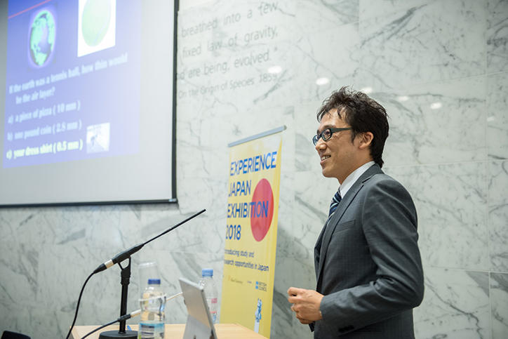 本フェアも今年で8回目となり、12の日本の大学・日本語学校および在英日本政府関連機関のブースに、約500名の大学生、高校生とその保護者らが詰めかけました。ブースでの個別相談と並行して、日本留学の基礎知識、元留学生の体験談、短期留学・研究助成プログラムなどを紹介するセミナーも行われました。また、日本の先端研究の一例として、慶應義塾大学理工学部の奥田知明准教授が“A Cleaner Breath for a Healthier Life – The Importance of Air Quality Research in Urban Environments”と題する講演を行いました。ブースは行列ができるほどの盛況で、セミナーでは多くの質問が投げかけられました。
