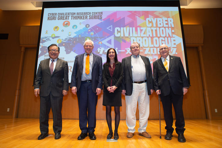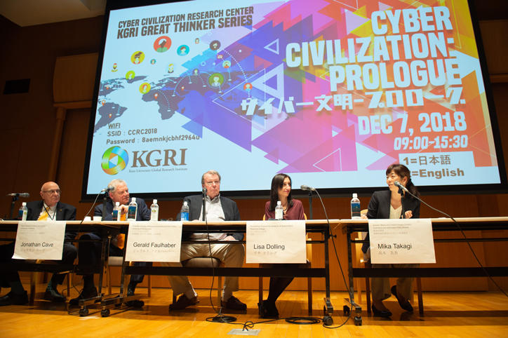 12月7日(金)、三田キャンパス北館ホールにて、サイバー文明研究センター主催のイベント、“KGRI Great Thinker Series-Cyber Civilization: Prologue”が開催されました。当日は、英国ウォーリック大学のシニアリサーチフェローであるジョナサン・ケーヴ教授、米国ペンシルベニア大学のジェラルド・ファルハーバー名誉教授、米国ローズモント・カレッジ学長のリサ・ドリング教授を迎え、インターネットテクノロジーが教育、ビジネス、文化、そして人類社会に与えた影響と、今後の可能性や課題をテーマに公開講演が行われました。