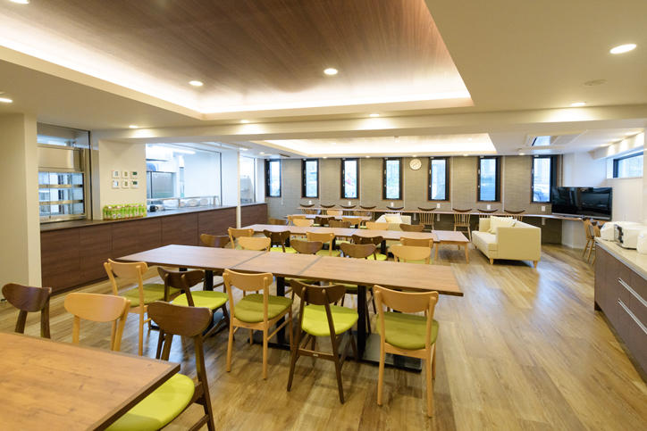 元住吉国際学生寮は、地上4階建ての留学生用居室60室と日本人学生用居室96室の計156室を擁する個室タイプの混住型学生寮です。食堂では朝夕の食事が提供され、健康面で大きなサポートとなります。また各階には共用キッチンダイニングやメッセージボードがあり、留学生と日本人学生同士が日常的に交流することができます。駅からのアクセスも良く、近くに大型スーパーやコンビニエンスストアもあるので買い物もとても便利で生活しやすい環境です。