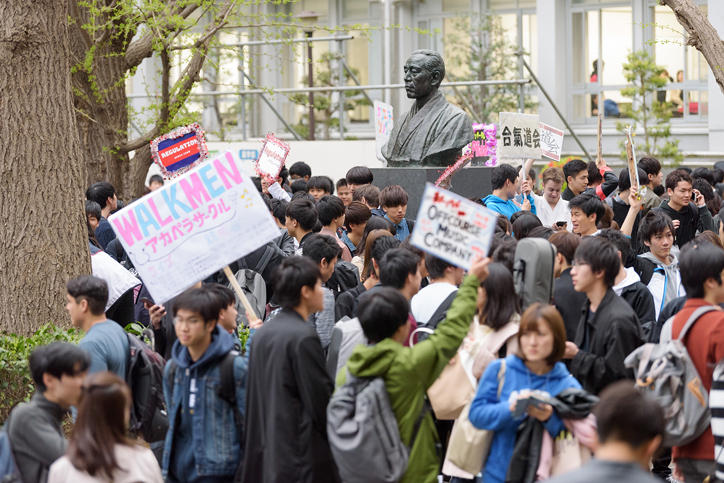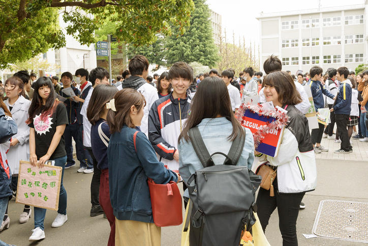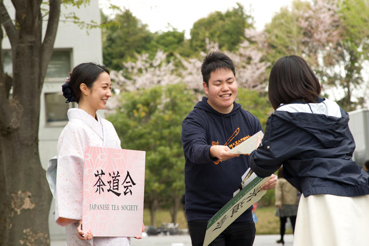 オリエンテーション期間の日吉・湘南藤沢キャンパスでは、ガイダンスや、さまざまな学生団体による新入生の勧誘、ステージイベントなどが行われ、賑わいをみせていました。(撮影日:2018年4月5日)