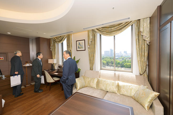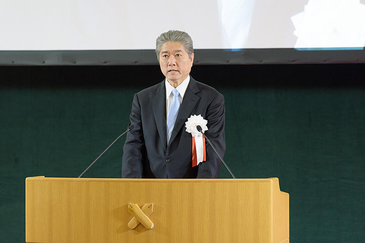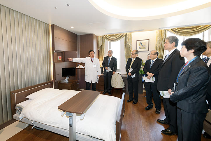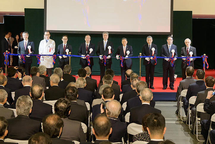竣工式には、義塾関係者ならびに設計・施工関係者、来賓・招待者など330名以上が出席しました。最初に挨拶に立った長谷山彰塾長は、次代の慶應医学・医療を担う人材育成の場として発展することへの期待を述べました。次に、天谷雅行医学部長から挨拶が、岩沙弘道評議員会議長から祝辞がありました。竹内勤常任理事から、新病院棟建設事業に関する説明ならびに募金活動報告があり、引き続き北川雄光病院長が1号館の概要説明を行い、無事に竣工を迎えられたことに対する感謝の意と、慶應義塾大学病院のさらなる発展に向けた決意を述べました。