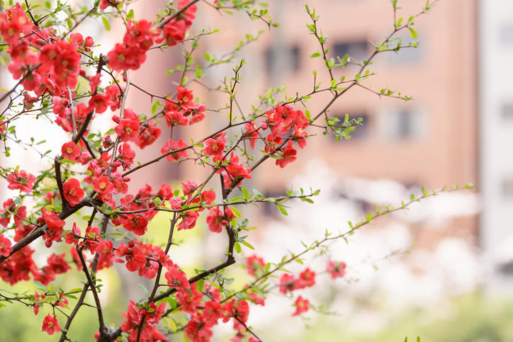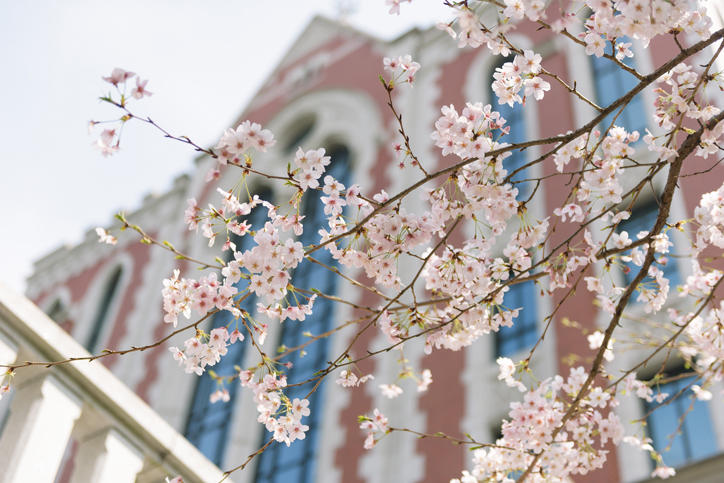 3月から暖かな日差しが届き、各キャンパスでも例年より早く開花が進みました。春の風に揺れる満開の桜のもと、卒業生はじめ、舞い散る花びらをカメラに収める人の姿が見られました。新入生を迎えた現在は、さわやかな若葉が顔をのぞかせています。