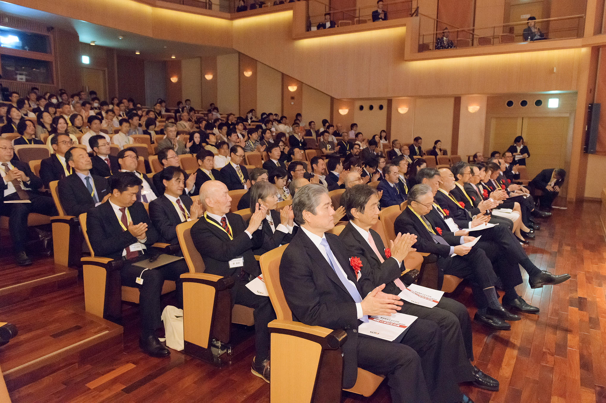 式典は日吉キャンパス協生館の藤原洋記念ホールを会場に、ほぼ満席の約400名の入場者とともに盛大に行われました。式典では長谷山彰塾長、青山藤詞郎常任理事、安西祐一郎日本学術振興会顧問(元塾長)、栗田るみ横浜市港北区長らの来賓に加え、6名の感謝状贈呈者から祝辞とともにSDMへの期待が語られました。