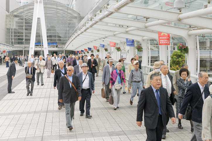 塾員招待会は、1953年に、卒業後満25年と50年以上にあたる塾員(卒業生)の方を大学卒業式の来賓として招待したのが始まりです。現在は卒業25年の方を卒業式に、卒業50年の方を入学式にそれぞれお招きしており、1986年からは卒業51年以上の塾員を対象とした招待会を毎年開催しています。65回目となる今年は、昨年に引き続き横浜で開催され、1967年以前卒業の約4200名が参加しました。