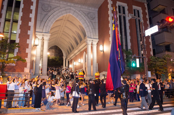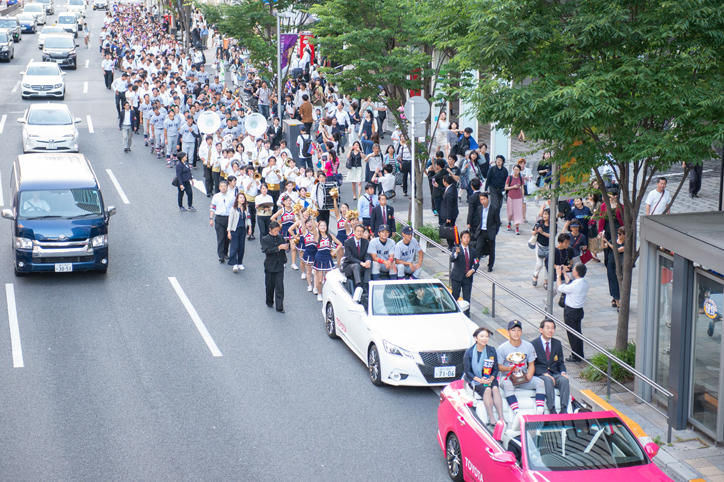 閉会式終了後、明治神宮外苑・絵画館前から三田キャンパスまでのパレードと三田山上での優勝祝賀会が行われ、パレードには約1000人、優勝祝賀会には約1500人の塾生、塾員(卒業生)などが参加し、27年ぶりとなる連覇の喜びを分かち合いました。