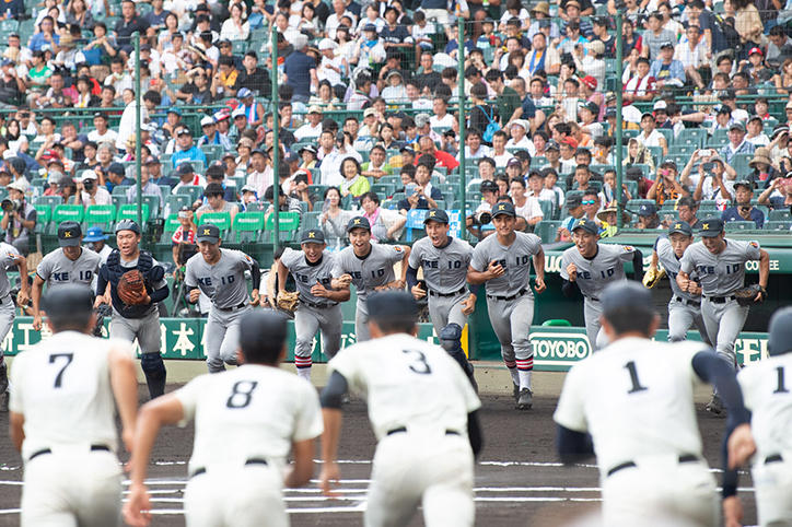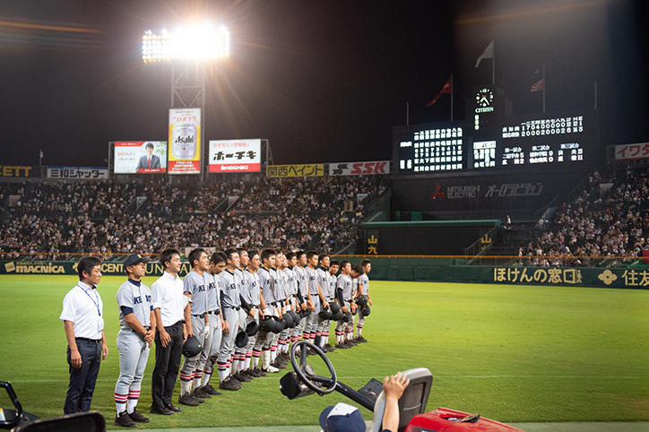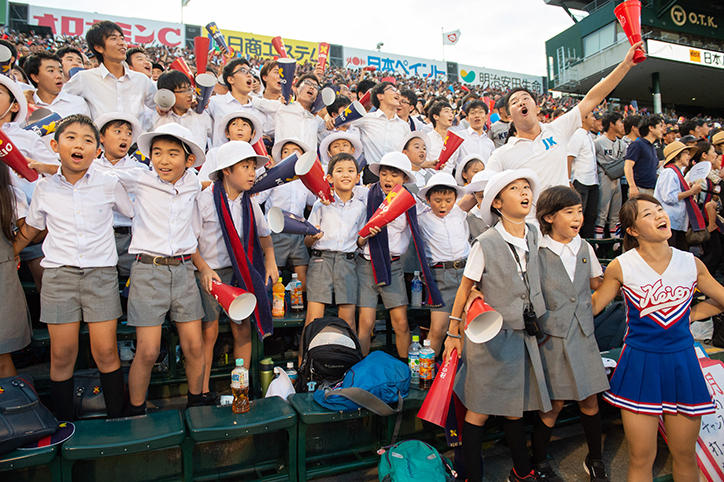 満員となった1塁側アルプススタンドの応援席では、幼稚舎から大学までの在校生・卒業生・教職員などが一丸となって大声援を送り、得点時には「若き血」の大合唱が甲子園を轟かせました。10年ぶり18回目の出場となった記念すべき夏の第100回記念大会で、最後まで諦めることなく清々しい闘いを見せた選手たちの健闘を称え、応援スタンドからは惜しみない大きな拍手が送られました。