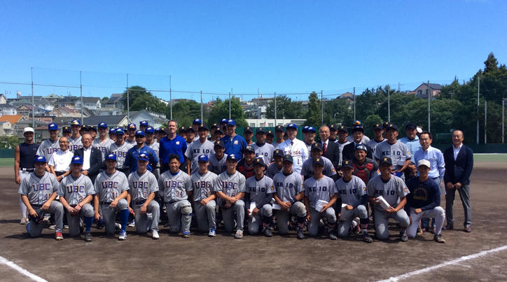 8月17日(金)、カナダのブリティッシュ・コロンビア大学(UBC)の一行が来塾し、日吉キャンパス下田地区野球場にて、慶應義塾大学体育会野球部とUBCサンダーバードとの間の親善試合が行われました。試合の前には、サンタ・J・オノUBC学長と長谷山彰塾長とがマウンドに立ち、それぞれ記念の一球を投げました。