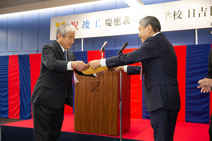 竣工式には、渡部直樹常任理事をはじめとする義塾関係者、設計・施工関係者などが出席しました。感謝状、記念品の贈呈式に引き続き、披露式の挨拶では、青山藤詞郎常任理事、古田幹高等学校長より施工に尽力した関係者や、地域の方々への感謝が述べられました。また、校長からは、人との繋がりの中で「協」力しながら「育」むという、高等学校の新しい教育モデルである『日吉協育モデル』の構築と実践の場として協育棟を活用していくという趣旨も語られました。式後には、施設の見学が行われました。