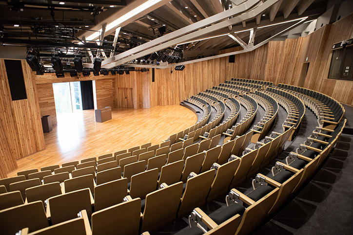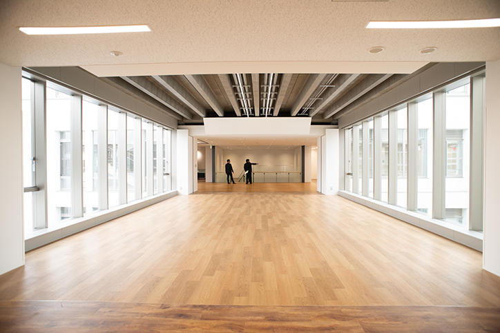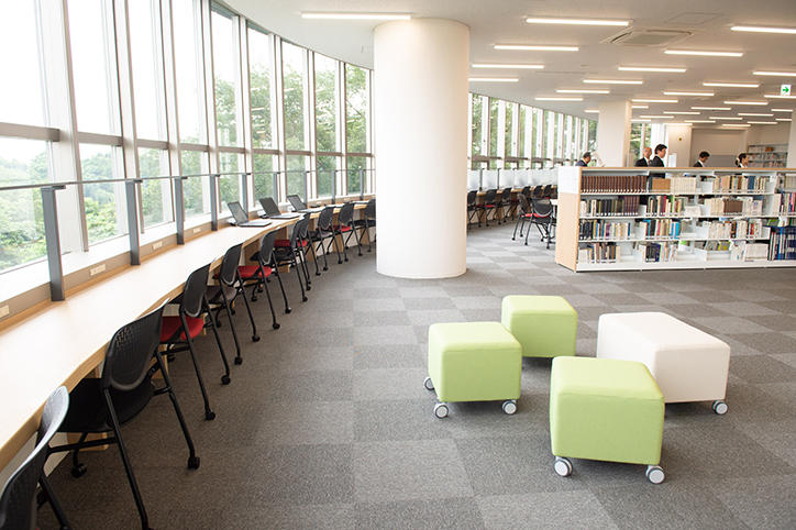 日吉協育棟は、12万冊の蔵書を誇る図書室を中心として構成され、寄贈図書を自由に利用できるビブリオラウンジを含む3つのラウンジと、高等学校ゆかりの資料が展示されるアーカイブのスペースのほか、トレーニングルーム、和室、ホールなどが設けられています。1934年竣工の第一校舎とも調和するように設計された日吉協育棟は、内装の一部に慶應義塾の学校林である宮城県南三陸志津川の森の杉が使われており、また、各所に設けられた大きな窓からは、日吉の森の広大なパノラマを一望することができます。