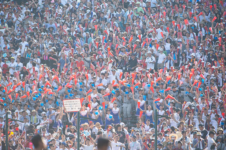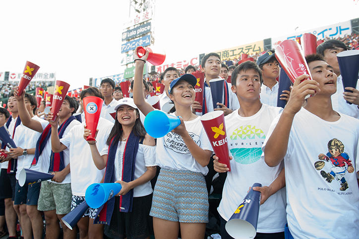 甲子園球場の応戦席には、猛暑のなか、多くの在校生・卒業生が集まり、赤と青のメガホンを振りながら大きな声援を送りました。サヨナラ勝ちの瞬間、アルプススタンドは大歓声に震えました。