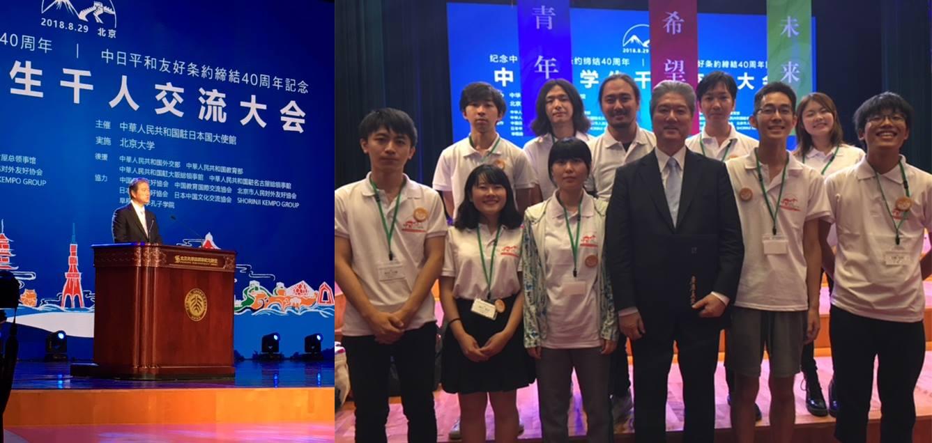 8月29日、長谷山塾長は日中平和友好条約締結40周年を記念して中国・北京大学で行われた「中日友好大学生千人交流大会」に出席し、祝辞を述べました。このイベントには、中国教育部の陳宝生部長、林芳正文部科学大臣をはじめとする両国政府の関係者に加え、慶應義塾大学から参加した学生も含む1,000人以上の日中の学生が出席しました。