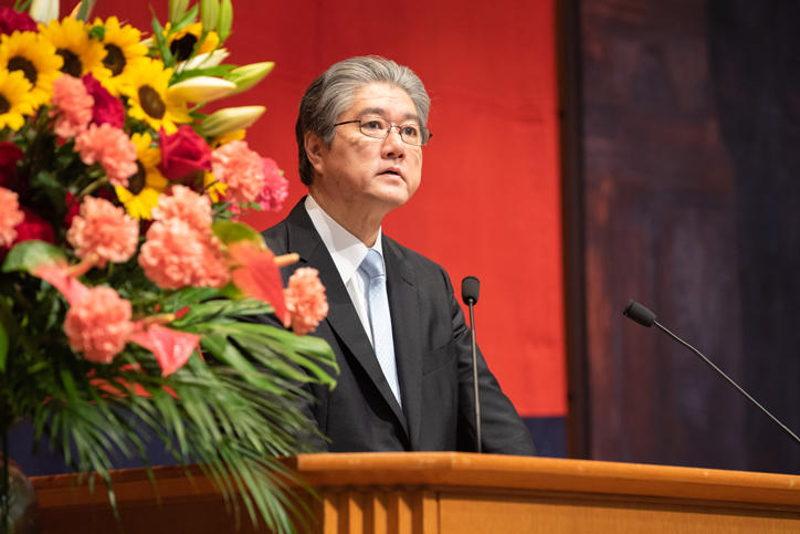 式は、青山藤詞郎常任理事の学事報告に続いて、長谷山彰塾長が式辞を述べました。長谷山塾長は、事物の本質を見抜く洞察力と、物事を解決に導く創造力をもって実証的に真理を明らかにするという「実学」の精神と、常識にとらわれず自ら判断し行動する「独立自尊」の精神を身につけてほしいと語りました。続いて、山元一法務研究科委員が教職員を代表して祝辞を述べました。式辞および祝辞は、会場にいる留学生にむけて、日本語だけではなく英語でも語られました。