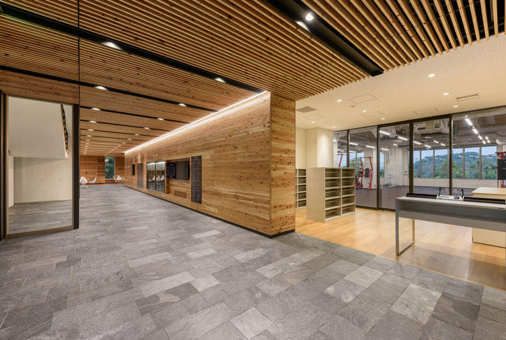 今回の受賞は、日吉キャンパスに建つ歴史的近代建築である旧館との連続性を保ちつつ、展望の良い空間や図書館、ホール、トレーニングルームといった異種用途の複合空間を見事にまとめあげ、眼下に広がる崖地と木材を活かした内装とがうまく調和していることなどが評価されました。