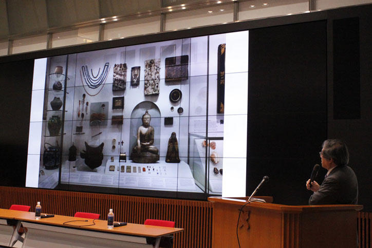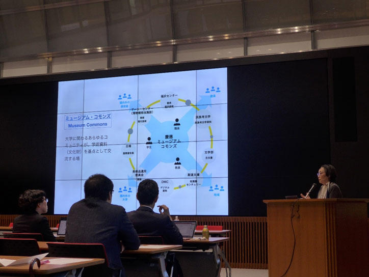 KeMCo機構長の松田隆美文学部教授からは、慶應義塾の分散型ミュージアムの核として、文化財を巡る創造的な活動を支え、新たな知識や人々に出会うオープンスペースとして機能するKeMCoの役割が紹介されました。副機構長の渡部葉子アート・センター教授からは、KeMCoで展開されるアクティブ・ラーニング・プログラム「オブジェクト・ベースト・ラーニング(Object-based Learning)」の概要や海外における展開、教育研究における重要性が語られました。また、所員の重野寛理工学部教授からは、慶應義塾の文化財の幅広い活用を支えるデジタル・プラットフォームのコンセプトや、教育におけるデジタル技術の活用についての紹介がありました。