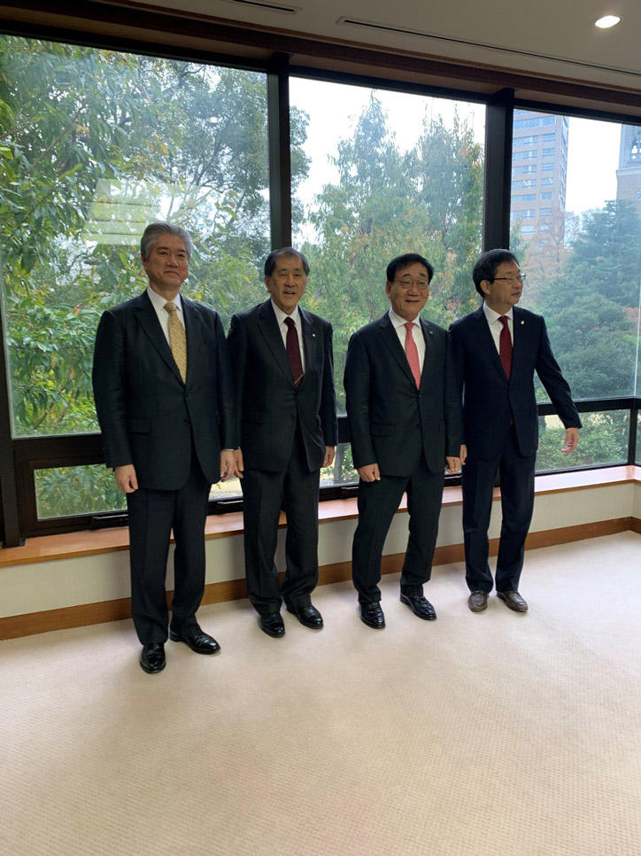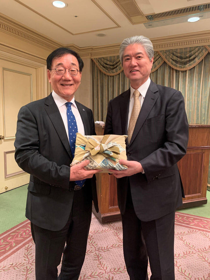 11月26日は歓迎夕食会が開催され、Gwan-pyo Nam駐日韓国大使が来賓として挨拶を行いました。長谷山塾長は、慶應義塾大学の国際展開およびその運営等について、世界的見地から塾長の諮問に応える有識者組織「グローバル・アドバイザリー・カウンシル」(Global Advisory Council)のメンバーの一人である延世大学のYong-Hak Kim総長と、和やかな雰囲気のもとで、両大学間のさまざまな分野でのさらなる連携強化に向けた懇談を行い、記念品の贈呈を行いました。