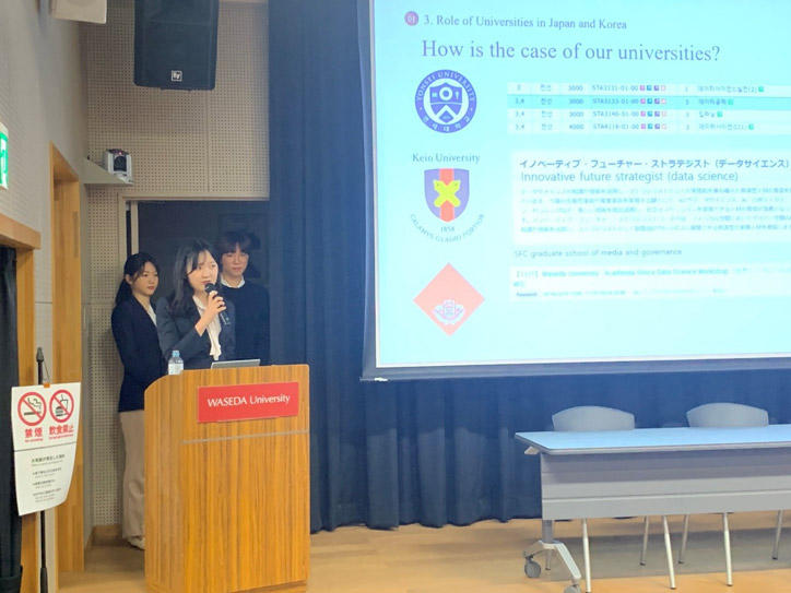 今回のフォーラムのテーマは"Visions and Actions for Sustainable Society: Roles of Universities in Korea and Japan" で、11月27日午前の学長セッションに引き続き、午後には学生セッションと研究者セッションが行われました。学生セッションでは、持続可能な社会における大学が果たすべき役割について、4大学を代表する学生が発表を行い、4学長からの講評を受けました。研究者セッションでは、SDGsにおける①教育が果たす役割、②地域コミュニティとの連携という2つのテーマで、4大学の研究者による発表および意見交換が活発に行われました。