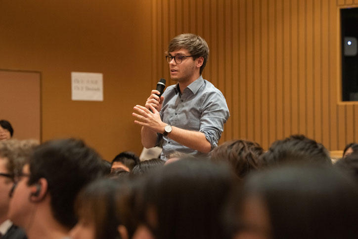 長谷山塾長からの紹介に続き、メルケル首相は、今回の交流の機会に感謝の意を表し、さっそく学生たちに質問を促しました。日独の両国の共通の課題から、教育政策、AIなどの科学技術が抱えるジレンマや、個人情報、安全保障に至るまで、多岐にわたる質問が次々に飛び出し、首相はそのひとつひとつに熱心に答えました。