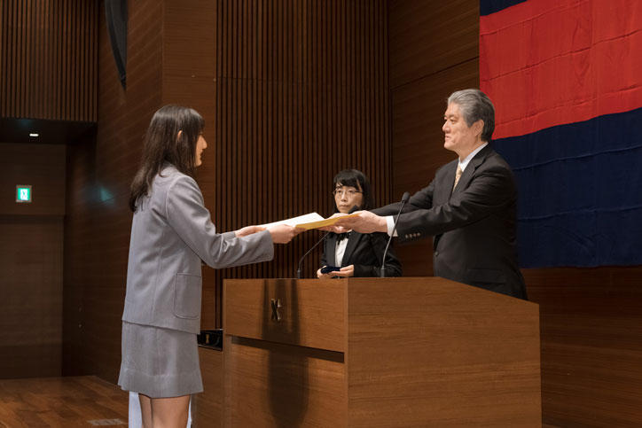 授与式は、審査委員長の大森正仁常任理事による審査を終えての講評に続き、長谷山彰塾長からの賞状と記念品の贈呈、祝辞がありました。その後、受賞者を囲む懇談会がザ・カフェテリアに会場を移して行われました。