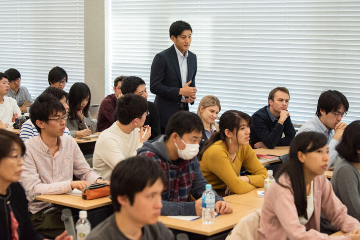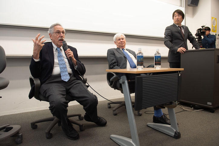 イベントの第1部として、南校舎435教室で藤原一平経済学部教授の司会のもと、学生を対象とした意見交換会「ノーベル経済学賞受賞者に聞いてみよう」が行われました。留学生を含む学生からは、昨今の経済情勢の変化を映じて、「自動化(オートメーション)やグローバル化が経済社会にどのような変化をもたらすのか」といった質問に加え、研究者を目指す学生へのアドバイスとして、「どのようにして、アイデアを生みだすのか、そして、よい研究テーマをみつけるのか」、「大学院時代をどのように過ごせばよいのか」など、多岐にわたる質問がありました。