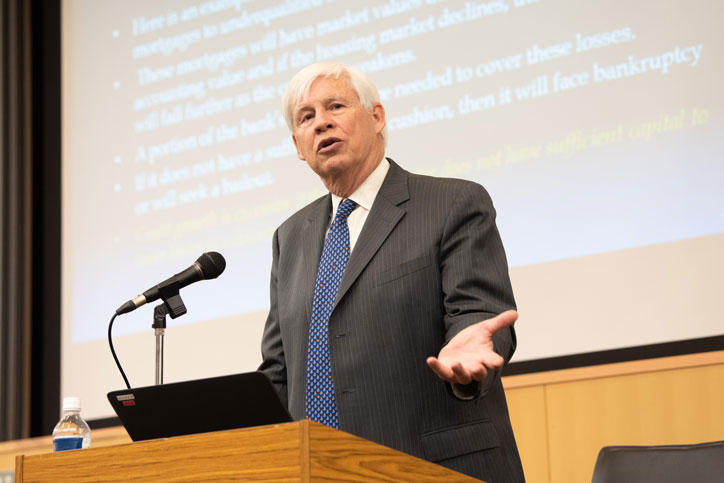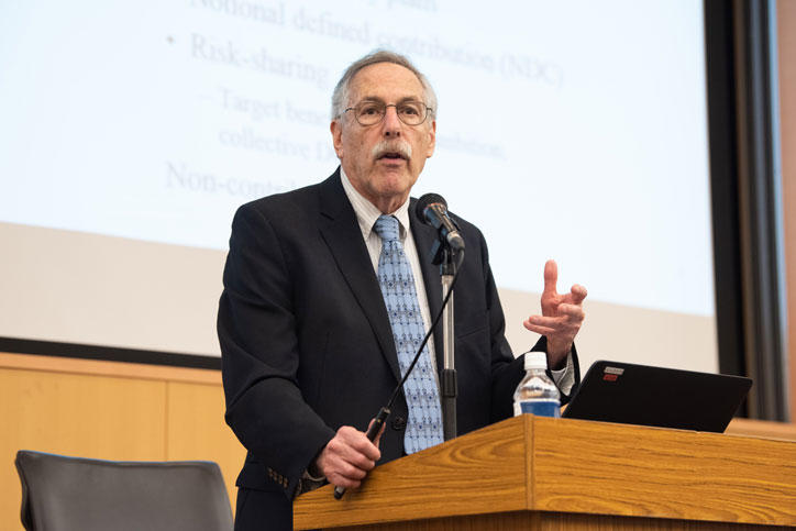 第2部では、南館ディスタンスラーニングルームでエングル氏とダイアモンド氏がそれぞれシステミック・リスクと年金制度に関する講演を行いました。会場には、経済学部・経済学研究科を中心とした学生や教員、評議員他が多く参加し、熱心に耳を傾けていました。