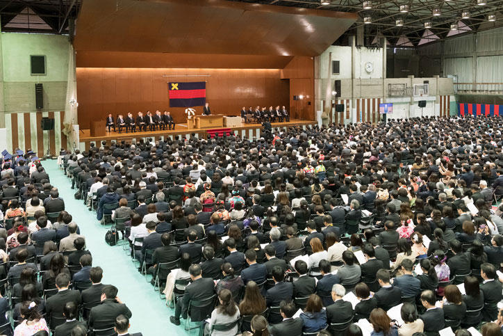 2018年度大学院学位授与式が、3月28日(木)に日吉会堂で行われました。日吉記念館が建て替え工事中のため、昨年に引き続き、日吉キャンパスにある日吉会堂での実施となりました。今年度の学位授与者数は、14研究科合計1,712名(博士学位221名、修士学位1,324名、専門職学位167名)でした。