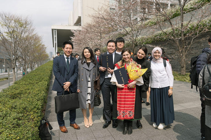 式には外国人留学生も多く参列し、幅広い年代の修了者がその家族とともに日吉キャンパスに集いました。式典後、修了者は研究科ごとの会場で学位記を受け取り、見ごろを迎えた満開の桜のもと記念撮影をするなど、それぞれの新たな門出を祝いました。