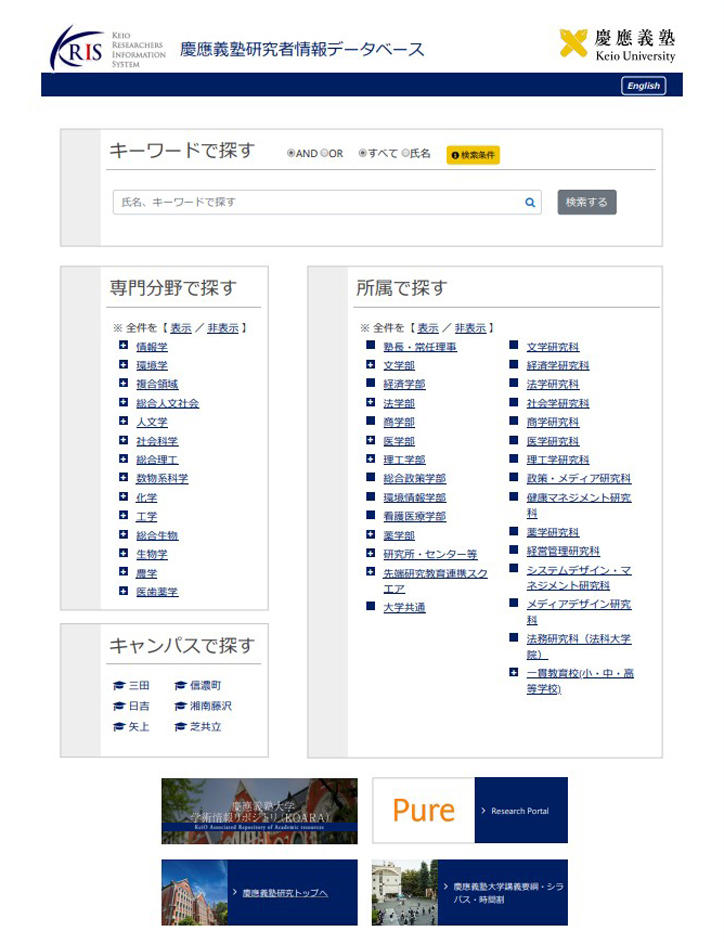 K-RISは、慶應義塾大学の研究・教育活動の状況を国内外に公開する検索システムで、今回の新システム導入により、検索の利便性が向上するとともに、研究者の入力負担が軽減され、タイムリーなデータ更新が可能となりました。新たなK-RISを活用し、国内外に向けてさらなる研究・教育活動状況の発信を行っていきます。
