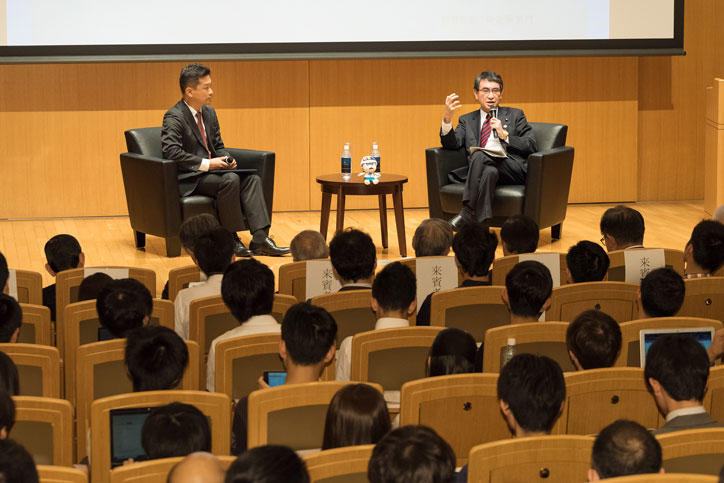 河野外務大臣は講演で、日本が行っている技術協力や資金協力の実績を紹介し、今後は特に司法整備支援等の技術協力が重要であると語りました。また日本がアメリカから受けた資金援助が、戦後の復興おいて重要な役割を果たしたことを話し、国際協力は「持ちつ持たれつ」であると述べました。講演に続き、神武直彦SDM教授がモデレータを務め、河野大臣と参加学生の対話が行われました。SDMだけではなく、理工学部や医学部の学生からも多岐にわたる質問がなされ、河野大臣はその一つ一つに丁寧に応じました。