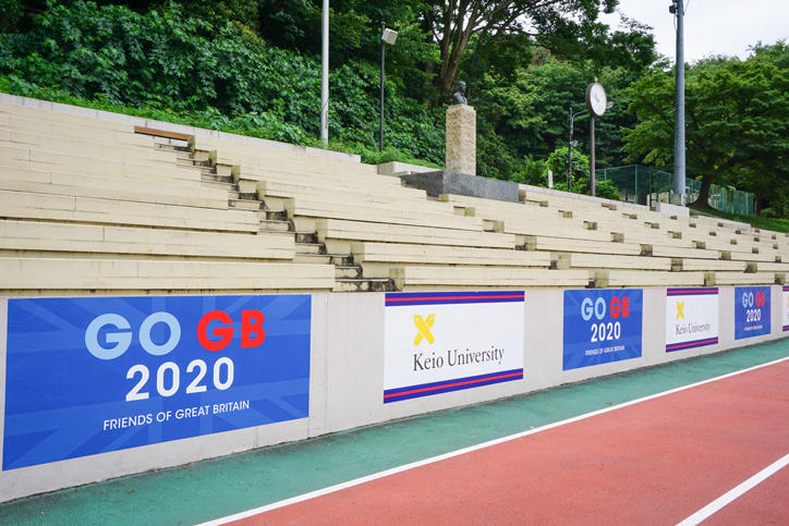 この7月に、協生館の入口、プール、陸上競技場、蝮谷体育館など、日吉キャンパス内の一部の施設に「GO GB 2020(がんばれ、英国代表チーム)」のバナーを設置しました。バナーには、パートナー大学として、練習中のTeam GBの選手たちの活躍を願う意味が込められています。
