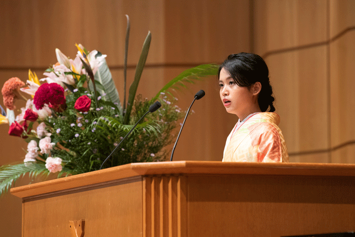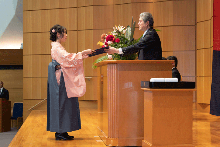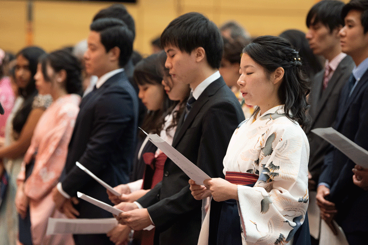 式では、学事報告に続いて長谷山塾長から卒業生の代表に学位記が授与されました。長谷山塾長は式辞において、福澤の「人間交際」や「実学」の精神についてふれ、慶應義塾の「独立自尊」の気風の中で学んだことを生かし、社会の一員として活躍してほしいと述べました。その後、柳町功総合政策学部教授が教職員を代表して祝辞を述べ、英語による卒業生代表答辞に続き、塾歌を一同で斉唱し式典は終了しました。