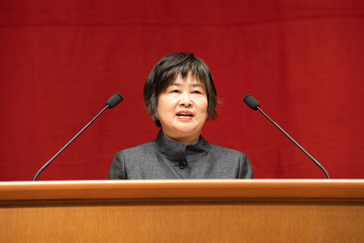 その後、西澤直子福澤研究センター教授(同センター副所長)が「認めあう社会―福澤諭吉の女性論・家族論に学ぶ」と題して記念講演を行いました。福澤諭吉が著した様々な文献を紐解きながら、男女の平等、女性の地位向上に必要なことを説いた福澤の女性論・家族論を紹介し、現代日本における女性の社会進出についての示唆に富んだ講演となりました。