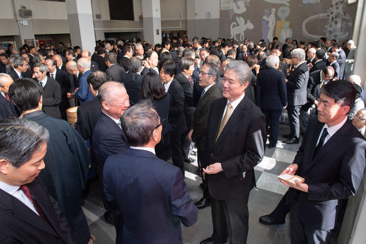 式典終了後は、会場を学生食堂ホールに移して「新年名刺交換会」が行われました。今年も三田の山には多くの塾生、塾員、教職員が集い、福澤先生に思いをはせるとともに、賑やかに新年の挨拶が交わされました。