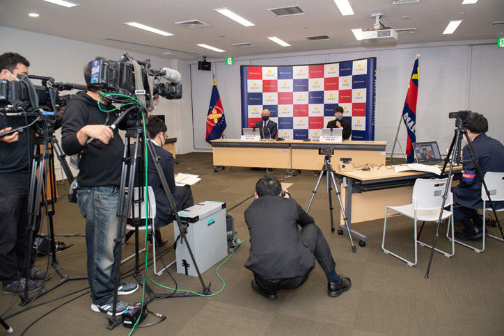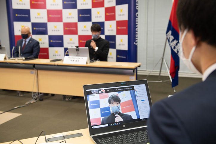 今年は感染症対策のため来場する報道陣の人数を制限し、オンラインで記者会見を行いました。指名を受けた部員たちは堀井哲也監督とともに登壇し、指名の喜びやこれまで支えてもらった家族への感謝の気持ち、今後の意気込みなどを語りました。